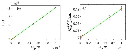 Calibration plots of the (a) current peak vs. IP concentration and (b) absorbance at 390 nm and at +0.90 V vs. IP concentration.