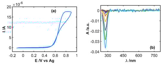 SEC experiment of the drug diluted 19/100 in 0.1 M HCl (1.46 × 10−4 M IP) between −0.10 and +0.90 V at 0.01 Vs−1. (a) Cyclic voltammogram and (b) evolution of UV/Vis absorption spectra during the anodic scan.