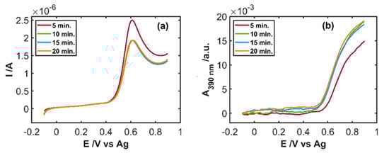 To optimize the time required to remove the antioxidant species four different set of experiments were carried out, bubbling the drug sample solution with wet-air for 5, 10, 15, and 20 min, after which the SEC experiment was performed. Figure 8 shows the linear voltammograms and the linear voltabsorptograms at 390 nm for these four experiments. Aleudrine samples were replicated showing the same results. The current intensity of the anodic peak related to the sample bubbled only for 5 min, is 30% higher than the intensity reached by the other three cases, measured after bubbling wet-air for 10, 15, and 20 min (Figure 8a). In addition, the voltammograms registered for samples after bubbling 10, 15, and 20 min are completely overlapped indicating that after 10 min the sample does not change any more. In the same way, the linear voltabsorptograms at 390 nm after metabisulfite oxidation by bubbling wet-air for 10, 15, and 20 min are very similar (Figure 8b). In fact, their absorbance values at +0.90 V are practically the same, but it is a 25% lower for the sample bubbled for only 5 min. These differences indicate that bubbling time affects the quantification of IP and it seems that 10 min of bubbling wet-air is enough to remove, by oxidation, all the sodium metabisulfite in the drug.