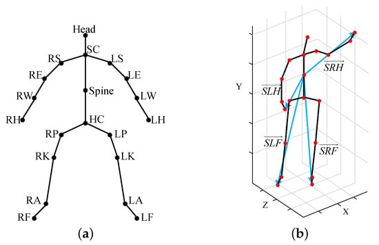 As shown in Figure 3b, we select the motion vector from the spine to the left hand to represent the motion of left upper limb, that from the spine to the right hand to represent the motion of right upper limb, that from the spine to the left foot to represent the motion of left lower limb, and that from the spine to the right foot to represent the motion of right lower limb, respectively, denoted , , , .
