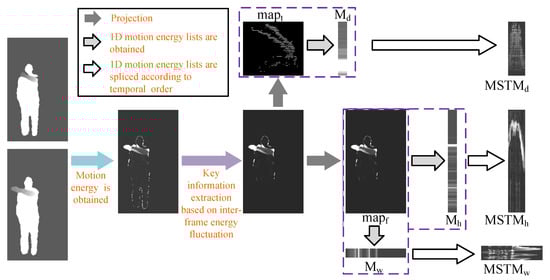 To describe the action information more comprehensively and accurately, this paper proposes a feature representation algorithm, called Motion Spatio-Temporal Map (MSTM). MSTM can completely express the spatial structure and temporal information. This algorithm calculates the difference between adjacent frames of depth sequence to obtain the motion energy. Next, the key information is extracted from the motion energy by key information extraction based on inter-frame energy fluctuation. Then, the key energy is projected to three orthogonal axes to obtain the motion energy list of the three orthogonal axes. Finally, the motion energy list is spliced in temporal series to form MSTM. The flow illustration of MSTM is shown in Figure 5.