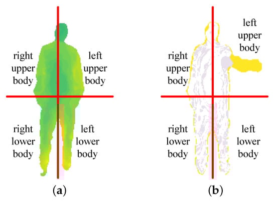 Firstly, we calculate the height range and width range of human activity area at the initial moment of actions. The body is divided into upper body and lower body according to the hip center of the body. The body is divided into left body and right body according to the symmetry. Finally, the body is divided into four regions: left upper body (LU), right upper body (RU), left lower body (LL), and right lower body (RL). The motion energy of the body is the sum of the motion energy of four regions. The division of human activity areas is shown in Figure 6.