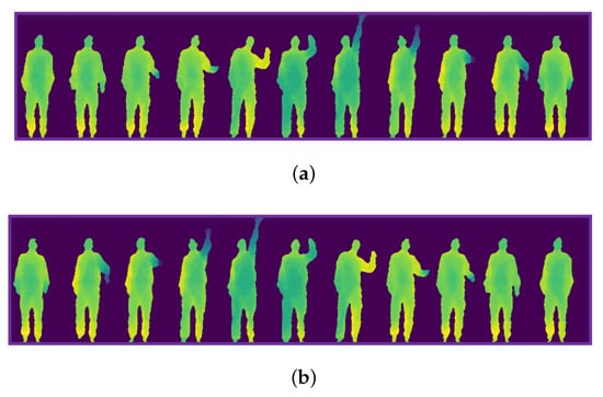With the development of depth sensors, scholars began to use depth sequence to study human action recognition. Numerous scholars [] use depth motion map (DMM) for action recognition research. Each frame in the depth sequence is projected onto three orthogonal cartesian planes to form three 2D projection maps according to front, side, and top views, denoted , , . The motion energy of two consecutive projection images is respectively accumulated to form the DMM of three views. The calculation of DMM is expressed as: