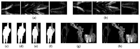 Figure 8a,b are the MSTM of positive order and reverse order high throw respectively. From left to right are the MSTM of height axis, width axis and depth axis respectively. Owing to MSTM reflects the change of the energy information on the three orthogonal axes, it preserves the spatial and temporal information completely. Positive order and reverse order actions have the same motion trajectories and opposite temporal orders, the final MSTM is symmetric along the time axis and easy to be distinguish. In contrast, Figure 8e,f respectively represent the MHI of positive order and reverse order high throw. MHI retains part of temporal information of the actions and has the ability to distinguish between positive order and reverse order actions. However, due to the coverage of the trajectory and the absence of the depth information, MHI cannot fully express the spatial information. Figure 8c,d are the MEI of positive order and reverse order high throw, respectively. Figure 8g,h are the DMM of positive order and reverse order high throw, respectively. MEI and DMM do not involve temporal information, so they cannot be distinguish. MEI does not involve the depth information, which means the spatial information is incomplete. DMM contains depth information and expresses spatial information fully.