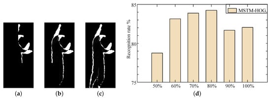 Figure 9a shows the key motion energy of tennis serve retained when . It can be seen that the value of is too small, much key information is mistaken for redundant, and the possibility of this action being recognized as tennis serve is reduced. Figure 9b shows the key motion energy of tennis serve retained when . Compared with the original motion energy in Figure 9c, it not only retains the key information, but also removes the energy of the area that the motion is not obvious. Figure 9d shows the recognition rate of MTSM-HOG when setting different according to Setting 2. It can be seen that MSTM-HOG achieves the highest recognition rate when . So we set to 80% in the following experiment.