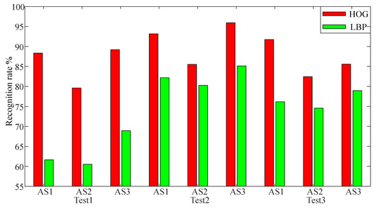 Due to excessive noise, if the proposed MSTM is directly classified, the recognition results are affected. In this paper, we select Histogram of Oriented Gridient (HOG) [] operator and Local Binary Pattern (LBP) [] operator for feature extraction of image because they are not sensitive to light. HOG operator uses the image unit of pixels to segment the image, combines every image units into an image block, and slides the image block of 10 pixels to extract the HOG features of the image. LBP operator uses sampling radius of 2 and sampling point of 8 to extract the LBP features of the image. According to Setting 1, the results on D1 are shown in Figure 10 when HOG features and LBP features of MSTM are extracted.