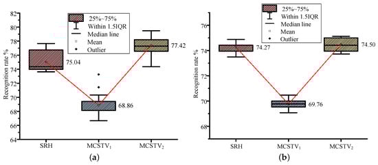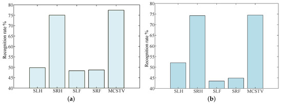 The data in Figure 14a,b are the recognition rates of various features running 20 times. The figure clearly shows the mean, maximum, minimum, median, outlier, upper quartile, and lower quartile of the multiple results. It can be seen from the two figures that the recognition rate of is higher than and slightly higher than SRH. The main reason is that MCSTV formed by weighted accumulation not only considers the motion vector of each limb, but also gives different weight to each limb according to its contribution, which can highlight the information of the main moving limbs and describe actions more accurately.