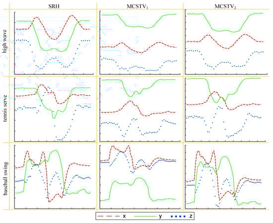 The main motion limb of the high wave is right upper limb, so the trajectory of MCSTV should be similar to SRH. Tennis serve and baseball swing are the actions that the movement of each limb is obvious, and right upper limb is the main motion joint, so the final MCSTV trajectory should be dominated by SRH. As shown in Figure 13, compared with , the trajectory of is closer to SRH. In particular, the trajectory of baseball swing’s is similar to SRH, but is different. It can be explained that MCSTV formed by weighted accumulation is more accurate and highlight the main moving limbs.