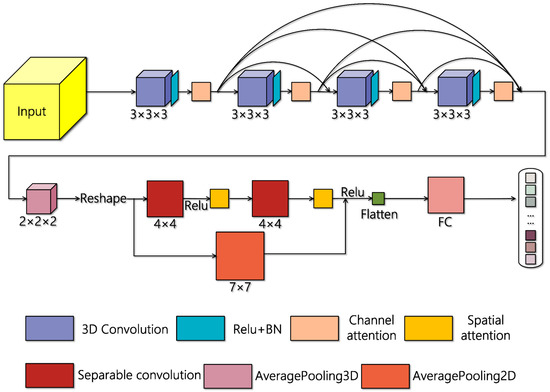 Currently, the attention mechanism has been successfully applied to the area of computer vision based on convolutional neural networks. The attention mechanism can be used to readjust feature maps generated by some layers of a neural network, which make it able to detect specific channel or spatial features [45,46]. The attention mechanism can be roughly divided into spatial attention and channel attention [34]. In our proposed model, channel attention was introduced to the refactor and refines the spatial–spectral features extract by every convolutional layer in the dense block and spatial attention was utilized to discriminate spatial information within the features generated by the depth separable convolutional layers.