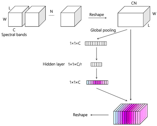 As mentioned above, the feature map extracted by a single 3D convolution kernel is modeled as a 3D cube, which can learn detailed features and correlation information across spectral bands of hyperspectral data to some extent. Take the convolutional kernel as an example, the same parameters are used for single channel 3D hyperspectral data during which each convolution operation covers three spectral bands. As the band span of the spectral features characterized by a single convolutional layer is fixed, the spectral feature mining has been limited to some extent. Therefore, in order to further refine the extracted spatial–spectral features, feature maps of all channels were concatenated in the spectral dimension to form a 3D tensor. The reshaped 3D tensor had a large channel number, which was equal to the original channel number times the original spectral band number. Then channel attention was introduced to assign a specific weight for each channel.
