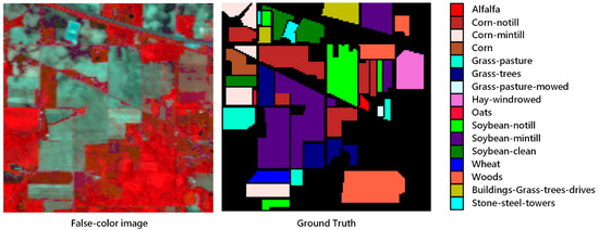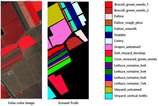 To observe the performance of the proposed model, three datasets: Indian Pines, Salinas and the University of Pavia were used in our experiment. Indian Pines was collected by the AVIRIS sensor in Indiana. The image had 145 pixels × 145 pixels and contained 224 bands. Apart from 24 bands absorbed by water vapor, 200 bands were available for classification. The spatial resolution of the image was 20 m, and the spectral coverage was 0.4–2.5 μm. The number of labeled samples was 10,249, which were divided into 16 categories, including crops and natural vegetation such as soybean, corn, wheat, alfalfa and pasture. The Salinas dataset was acquired in California by the AVIRIS sensor and contained 204 bands for classification without water vapor absorption bands. The image size was 512 × 127 and the spatial resolution was 3.7 m. It contained 16 types of ground objects in total, and the spectral coverage was the same as Indian Pines. The dataset mainly included vegetables, bare earth and vineyards. The University of Pavia dataset contained nine classes, with a total sample size of 42,776. It contained 610 pixels × 340 pixels, with a spatial resolution of 1.3 m and a spectral coverage range of 0.43–0.86 μm. The dataset was collected in urban areas, mainly including trees, asphalt roads, bricks, pastures, etc. Figure 4, Figure 5 and Figure 6 show the distribution of each ground objects on the Indian Pines, Salinas and University of Pavia.