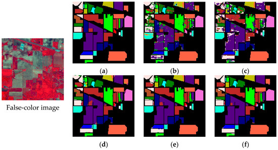 The classification maps of Indian Pines. (a) Ground truth. (b–f) Predicted classification maps for Res-2D-CNN, Res-3D-CNN, HybridSN, R-HybridSN and AD-HybridSN respectively.