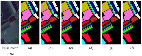 The classification maps of Salinas. (a) Ground truth. (b–f) Predicted classification maps for Res-2D-CNN, Res-3D-CNN, HybridSN, R-HybridSN and AD-HybridSN respectively.