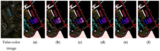 The classification maps of the University of Pavia. (a) Ground truth. (b–f) Predicted classification maps for Res-2D-CNN, Res-3D-CNN, HybridSN, R-HybridSN and AD-HybridSN respectively.