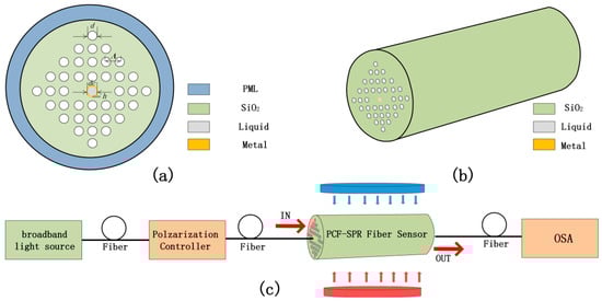 (a) The cross section of the proposed photonic crystal fiber-surface plasmon resonance (PCF-SPR) sensor; (b) Schematic diagram of the proposed PCF-SPR sensor in three-dimensional (3D) model; and, (c) Schematic diagram of the experimental set-up of the proposed sensor.