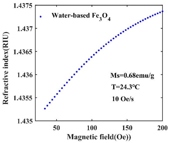 where nmf is the refractive index of the magnetic fluid, ns is the saturation value of the refractive index, n0 is the initial refractive index, α is the fitting coefficient, T is the working emperature, and Hc,n is the threshold. When the external magnetic field H is greater than Hc,n, according to formula (2), it can be calculated that nmf is a constant. By adjusting the concentration of the magnetic fluid, the refractive index of the magnetic fluid can be controlled [30]. At the same time, temperature and particle size also affect the refractive index of magnetic fluids [31]. The type of magnetic fluid used is water-based Fe3O4 magnetic fluid. The initial parameters were set to T = 24.3 °C, α = 5, Hc,n = 30 Oe, n0 = 1.4352, ns = 1.4385, magnetic fluid concentration = 0.68 emu/g, and the film thickness is 11.8 μm, working temperature is 24.3 °C, and sweep rate of the field is 10 Oe/s [32]. Figure 2 shows the curve of the refractive index of water-based Fe3O4 magnetic fluid with magnetic field.