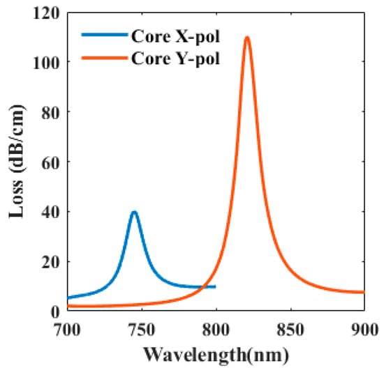 We used COMSOL Multiphysics 5.4 based on finite element analysis in order to simulate the proposed sensor structure. In order to approach the ideal situation, a perfect matching layer (PML) is added to the outermost area to absorb energy. The mesh generates a free triangle mesh. The complete mesh contains 16,502 domain elements and 1338 boundary elements. The number of degrees of freedom solved is 108,709. Both the x-polarized fiber core mode and the y-polarized fiber core mode can excite SPR due to the characteristics of the dual-core photonic crystal fiber. The Figure 3 shows that comparison of the loss spectra of x-polarized fiber core mode and the loss spectra of y-polarized fiber core mode. By comparison, it is found that under the same conditions, the polarization mode in the x-polarized is obviously not as good as the y-polarized in the excitation of SPR. When considering that our sensors need to use SPR for sensing, we choose y-polarized fiber core mode for study.