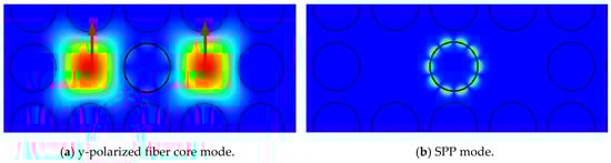 The optical field distribution of (a) the y-polarized fiber core mode and (b) SPP mode and the arrows represent the direction of the electric field.
