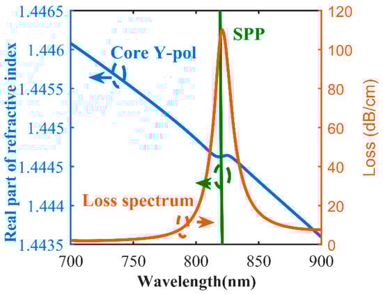 Real part of effective refractive index of the y-polarized fiber core mode and surface plasmon polariton (SPP) mode, and the loss spectra of the PCF-SPR sensor when the material of the metal layer is gold.