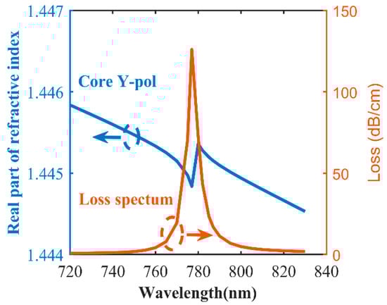 Figure 5 shows the real part of the effective refractive index of the y-polarized fiber core mode and SPP mode and the loss spectrum of the y-polarized fiber core mode when na = 1.44 and the thickness of the gold layer is 50 nm. The blue line is the real part of the effective refractive index of the y-polarized fiber core mode, the green line is the real part of the effective refractive index of the SPP mode, and the red line is the loss spectrum of the y-polarized fiber core mode. It can be seen that the dispersion relationship between the y-polarized fiber mode core and the SPP mode has an obvious intersection, as shown in Figure 5. As the wavelength increases, the loss of the y-polarized fiber mode first increases and then decreases. When the real refractive index of the y-polarized fiber core mode is equal to the real refractive index of the SPP mode, which is, the phase matching condition is satisfied, the loss of y-polarized fiber core mode reaches its maximum at 821 nm. Obviously, high coupling occurs at the wavelength of 821 nm, and the energy loss of the y-polarized fiber core mode is mainly caused by the SPP mode that is generated by excitation, and the loss of y-polarized fiber core mode is the largest at the wavelength of 821 nm. The blue line of effective refractive index representing the y-polarized fiber core mode has an s-shaped kink at the resonance wavelength as it drops. The reason for the s-shaped kink is that, when resonance occurs, free electrons cause resonant electrons to oscillate, which affects the evanescent field, resulting in a change in the mode of the PCF, and then the effective refractive index of PCF changes suddenly. The stronger the resonance, the more obvious the s-shaped kink. Figure 6 shows the real part of the effective refractive index and the loss spectrum of the y-polarized fiber core mode when na = 1.44 and the thickness of the silver layer is 50 nm. The blue line is the real part of the effective refractive index of the y-polarized fiber core mode, and the red line is the loss spectrum of the y-polarized fiber core mode. As the wavelength increases, the loss of the y-polarized fiber mode first increases and then decreases. When the phase matching condition is satisfied, the loss of y-polarized fiber core mode reaches its maximum at 777 nm. When comparing with Figure 5, it can be found that when silver is used as the coating material, the loss peak is sharper, and the s-shaped kink is more obvious. This is because the nature of silver is more active.