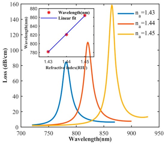 When the refractive index of the central air hole changes, the phase matching condition and the resonance wavelength also change. Figure 7 shows the effect of different central pore refractive index on the designed sensor, which, under the condition that other parameters remain unchanged, the thickness of the gold layer is 50 nm, the loss spectrum when na is 1.43, 1.44, and 1.45, respectively. In Figure 7, the peak losses at the resonance wavelengths of 782 nm (na = 1.43), 821 nm (na = 1.44) and 864 nm (na = 1.45) are 84.5 dB/cm, 110.1 dB/cm and 158.4 dB/cm, respectively. Obviously, as na increases, the resonance wavelength is red-shifted, and the peak loss increases linearly. The main reason is that with the continuous increase of na, the difference between the overall refractive index of the photonic crystal fiber and the refractive index of the central air hole increases, and the excited SPP mode is enhanced. Sensitivity is an important parameter of the sensor, which describes the change of the resonant wavelength of the sensor to the unit refractive index, which can be defined, as [35]: