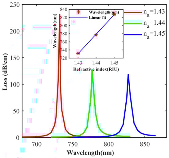 The use of different coating materials will affect the performance of the designed sensor. Figure 8 shows that, when the condition that other parameters remain unchanged, the thickness of the silver layer is 50 nm, the loss spectrum when na is 1.43, 1.44, and 1.45 respectively. In Figure 8, as the refractive index increases, the resonant wavelength red shifts and the loss decreases. The peak losses at the resonance wavelengths of 732 nm (na = 1.43), 777 nm (na = 1.44) and 827 nm (na = 1.45) are 231 dB/cm, 127 dB/cm, and 118.4 dB/cm, respectively. When silver is used as the material, the loss is obviously larger than that of gold. At the same time, with the continuous increase of na, the peak loss is obviously reduced but not linearly. The reason is that the dielectric constant of the silver has changed. The inset in Figure 8 shows the change in the resonant wavelength of the refractive index of na between 1.43 and 1.45. In the inset of Figure 8, the slope is the sensitivity and the sensitivity of the sensor is 4755 nm/RIU. A comparison of the sensitivity of the proposed PCF-SPR when the material of the metal layer are Au and silver is shown in Table 1.