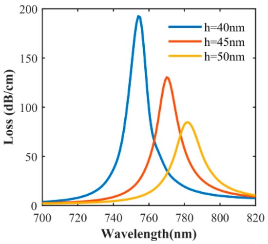 Surface plasmon resonance is very sensitive to the thickness of the metal layer. The thickness of the gold layer is also an important factor affecting the half-width and amplitude of the resonance peak, so the influence of the thickness of gold layer on the sensor should also be considered. Figure 9 shows that the influence of the thickness of the gold layer on the sensor performance under na = 1.43 when other parameters are unchanged. As shown in Figure 9, the resonance wavelength is red-shifted and the loss peak value decreases with the increase of the thickness of gold layer. In Figure 9, under the condition of na = 1.43, the thickness of the gold layer is 40 nm, the peak loss is 192.5 dB/cm, and the resonance wavelength is 754 nm; when the thickness of the gold layer is 45 nm, the peak loss is 130.4 dB/cm, and the resonance wave moves to 770 nm; when the thickness of the gold layer is 50 nm, the peak loss is 84.7 dB/cm, and the resonance wavelength is 782 nm. Obviously, when the thickness of the gold layer increases from 40 nm to 50 nm, the resonance wavelength shifts to a longer wavelength, and the peak loss decreases sharply. The reason is that the thickness of the gold layer increases from 40 nm to 50 nm. When the metal thickness becomes thicker, the central air hole diameter is unchanged, the metal surface is closer to the core mode field, so that the contact area between the core mode field and the metal surface increases, and more light is coupled to the metal surface, and the resonance wavelength is red-shifted [36]. However, at the same time, the SPP mode decays quickly in the vertical direction. When the thickness of the gold film increases, the SPPs mode strength is weakened and the loss sharply decreases.