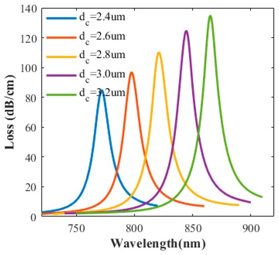 The diameter of the central air hole is also one of the important factors affecting sensor parameters. Figure 10 shows the Influence of dc on the loss spectrum under hAu = 50 nm when other parameters are unchanged. As shown in Figure 10, when the thickness of the gold layer does not change, as the diameter of the central pore increases, the loss increases, and the loss peak is red-shifted. This is because that, when the metal thickness becomes thicker, the central air hole diameter is unchanged, the metal surface is closer to the core mode field, so that the contact area between the core mode field and the metal surface increases, and more light is coupled to the metal surface, the loss increases. The reason is that the increase in diameter will make the core mode closer to the metal, and the coupling effect will be stronger, the excited SPP mode is more enhanced. The thickness of the gold layer and the diameter of the central air hole have great influence on the PCF-SPR sensor. When the gold layer is too thick and the diameter of the central air hole is too small, the loss will decrease and affect the peak value; when the gold film is too thin, the energy of the SPP mode at the film will be weak, which is unfavorable for SPR excitation, but the increase in diameter will make the core mode closer to the metal and the excited SPP mode is enhanced. Therefore, the choice of thickness and the diameter of the central air hole should consider the peak position and height as well as SPP excitation.