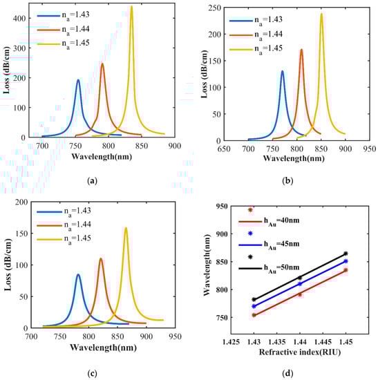 In summary, the thickness of the metal film, the metal material, and the refractive index of the central air hole affect the resonance wavelength and loss peak. Therefore, Figure 11a–c describe the loss spectra of na = 1.43, 1.44, and 1.45 when the hAu is 40 nm, 45 nm, and 50 nm, respectively, when gold is selected as the coating material. As shown in Figure 11a, when hAu = 40 nm, na = 1.43, peak loss is 192.5 dB/cm, resonance wavelength is 754 nm; na = 1.44, peak loss is 247.2 dB/cm, resonance wavelength is 791 nm; and, na = 1.45, peak loss is 439.4 dB/cm, resonance wavelength is 835 nm. The loss peak is gradually red-shifted. The main reason for this phenomenon is that the change of na causes the effective refractive index of the SPP mode to change, which causes the position of the intersection of the y-polarized fiber core mode and the SPP mode to move, and then causes the loss peak to move. At the same time, the overall effective refractive index of the sensor increases as the na increases, resulting in an increase in coupling efficiency, and the energy transmitted to the metal increases, the loss caused by SPP increases. The relationship between the resonance wavelength and na under different hAu is shown in Figure 11d. The red, blue, and black marks are the simulation results when hAu is 40 nm, 45 nm, and 50 nm, respectively, and the red, blue, and black lines represent the resonance wavelength fitting lines when hAu is 40 nm, 45 nm, and 50 nm, respectively. In Figure 11d, the fitted lines of the red, blue, and black lines are linear, which means that the designed sensor has good linearity. Table 2 shows the refractive index sensitivity calculated according to Formula (4).
