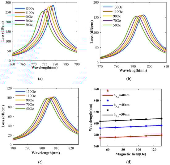 where, Δλpeak is the distance of the loss peak drift and ΔH is the change of the magnetic field. Figure 12a–c describe, when the magnetic field strength is in the range of 50–130 Oe, the loss spectrum of the central air hole when the thickness of gold layer is hAu equal to 40 nm, 45 nm, and 50 nm, respectively. It can be found that, at the same metal thickness, the loss peak resonance wavelength increases with the increase of the magnetic field, and the peak loss increases. The reason is that, according to Formula (2), as the magnetic field increases, the refractive index of the magnetic fluid in the central air hole becomes larger, and the overall effective refractive index of the sensor component increases with the increase in na, resulting in the coupling efficiency being enhanced, and the energy transmitted to the metal increasing, the loss peak red-shifting, and the loss increasing significantly. The relationship between the resonance wavelength and magnetic field under different hAu is shown in Figure 12d. The red, blue, and black marks are the simulation results when hAu is 40 nm, 45 nm, and 50 nm, respectively, and the red, blue, and black lines represent the resonance wavelength fitting lines when hAu is 40 nm, 45 nm, and 50 nm, respectively. Table 3 shows the magnetic field sensitivity calculated according to Formula (5).