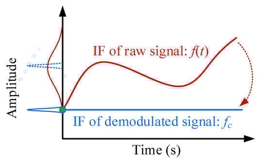 Before the demodulation, due to the modulation influence, the spectrum of the signal widely spreads around its IF as shown in Figure 1. Based on the GDT, with the known demodulation operator , the time-varying IF curve can be transformed into a constant frequency labelled as a blue line in Figure 1. As a result, its bandwidth is narrow with high energy concentration. Hence, the spectrum of the demodulated signal is more concentrated, than the original spectrum.