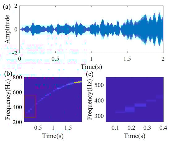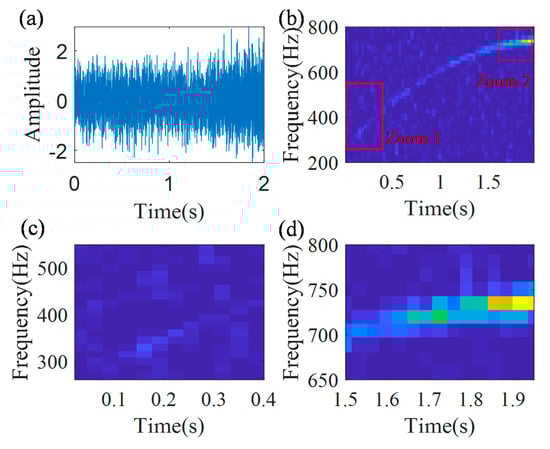 Figure 3 shows the simulated signal with a noise, its IF curve and its instantaneous amplitude curve. The instantaneous amplitude of the simulated signal is time-varying, as shown in Figure 3b, i.e., the instantaneous amplitude is relatively low in the initial part of the signal and is relatively high in the final part of the signal. The analytic signal obtained by using the Hilbert transform, is presented in Figure 4a. TFR of the analytic signal, generated by the STFT, and its local zooms are shown in Figure 4b–d, respectively. From the local zooms it can be seen, that the time-frequency ridge in the initial part is much blurry, than that in the final part. The main reason is that the noise pollutes the weak part of the signal.