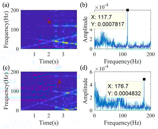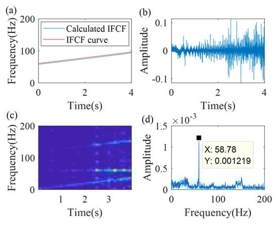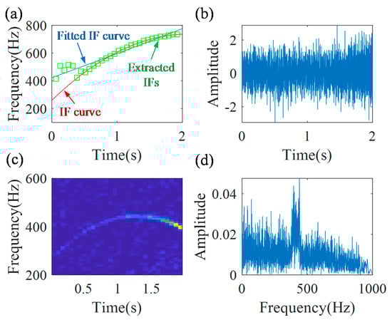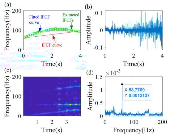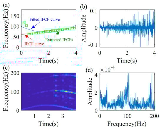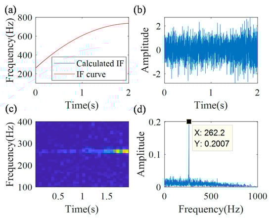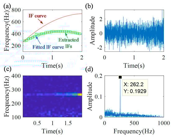 Let continue to the second iteration. The parameters of window function L and peak search range ∆p are the same, as the parameters in the first iteration procedure. The new IFs are extracted from the TFR of the first demodulated signal and they are plotted in Figure 6a. The fitted IF curve () is calculated using Equation (10), and it is presented as blue line in Figure 6a. It could be seen a close coincidence between the extracted IFs and the fitted IF curve. Then, the new demodulation operator is calculated . With the new demodulation operator, the second demodulated signal is obtained, as shown in Figure 6b. Its TFR and spectrum are shown in Figure 6c,d, respectively. There is a constant time–frequency ridge in the TFR. A clear non-smeared peak, whose frequency is 262.2 Hz, can be seen in the spectrum. Based on the termination criterion, i.e., , the iteration process is stopped.