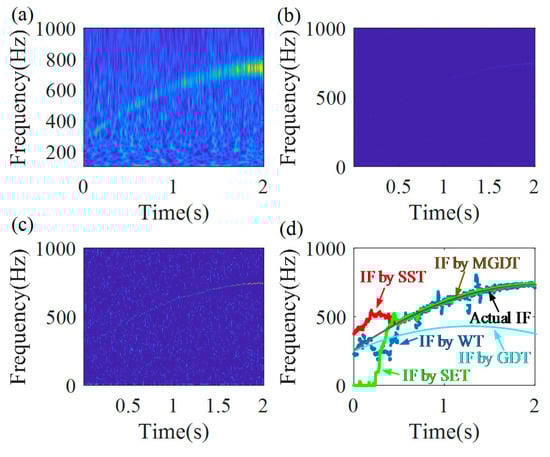 A popular method is to use the high-order information of the signal, such as the chirp rate, or frequency acceleration, to enhance the energy concentration for strong FM, which involves second-order SST [9] and higher order SST [10]. However, higher-order SST techniques are easy to be affected by noise because they are computed by the high-order derivative of the STFT and the WT. Recently, a new multi-SST (MSST) technique [11] was presented, which employs an iterative reassignment procedure to concentrate the blurry energy in a step-wise manner. MSST squeezes the time–frequency coefficients into the ridge, i.e., the curve along which the signal energy is locally maximum. However, for the ridge, MSST gives a biased estimate of an IF when dealing with nonlinear frequency modulations; therefore, it is difficult for MSST to estimate IF for nonlinear frequency modulations.