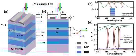 (a) 3D view; (b) cross-section view of configuration of the ultra-thin metallic nanoslit arrays on N-layer stacked LID–HID above the LID substrate (N is the layers of LID–HID, here take N = 3 as an example); (c) the transmission spectrum of 3-layer (N = 3) stacked LID–HID structures without metallic nanoslit arrays; (d) the spectra of the ultra-thin metallic nanoslit arrays on 3-layer (N = 3) stacked LID–HID above the LID substrate.