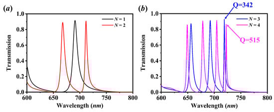 Figure 2 shows the classical transmission spectra of the ultra-thin metallic nanoslit arrays on a 3-layer LID–HID above the LID substrate, in which the period , the width of the metal stripe , the metal thickness , the LID thickness , and the HID thickness . For , shown as the black line in Figure 2a, i.e., for only one layer of LID–HID, the transmission peak with the full width at half maximum (FWHM) of 8 nm at 691 nm is due to the cooperative effect of a transmission mode and two suppressed modes located on both sides of the peak [19,20]. For the structure with , it is observed that there are two transmission peaks positioned at 668 nm and 712 nm in the optical regime. Similarly, when increasing the layers of LID–HID (noted as N) further, as shown in Figure 2b for and , three (at 656 nm, 692 nm, 719 nm) and four (at 649 nm, 678 nm, 705 nm, 723 nm) transmission peaks are appearing, respectively, in the spectra. It is noted that by increasing the layers N, new SP modes, including transmission modes and suppression modes, can be excited in the structure and produce the new ultra-narrow peaks. Also, widths of multiple peaks are reducing effectively with increasing N. For , it is observed that the minimum FWHM of the peaks at 719 nm (with a large transmittance ~0.9) is down to ~2.1 nm, and the quality factor (~342) is improved 3–4 times compared to the Q factor for . When , the minimum FWHM of the peak at 722 nm is down to ~1.4 nm and the quality factor (~515) is improved five times compared to the case of . This is because the positions of the suppression modes located on both sides of the peaks are getting closer as the number of suppression modes is increasing, therefore, the linewidth of peaks can be reduced effectively to improve the Q factor. It is concluded that it is not only possible to design the easily fabricated plasmonic structure with multiple narrow-band transmission peaks, but it also provides a new route in improving the Q factor.