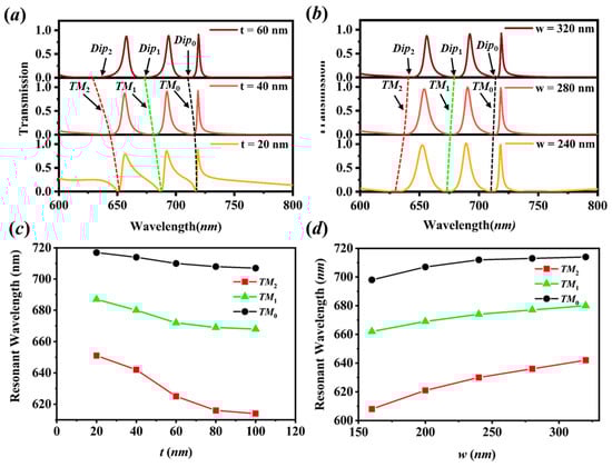 For further investigation of the mechanisms on the multiple transmission peaks, transmission spectra of the proposed structure of for various t are calculated in Figure 4a. It is observed that the hybrid SP waveguide modes noted as , , and have a blue shift, while the transmission modes in the multi-high/low-index dielectric cavity move little with increasing metal thickness t. It is inferred that the metal thickness t has a major impact on the hybrid SP waveguide resonances, while it has a weak influence on the transmission modes in the dielectric cavity. In fact, the effect of metal thickness t is similar to the interaction of thin metal grating on the substrate. With increasing the metal thickness t, the real part of the effective index of the hybrid SP modes would decrease [27], leading to the blue shift of resonant dips. From Figure 4c, it is clear that the dip position of mode decreases sharply, the position of mode reduces moderately, and the mode moves slowest. This is because the field of mode in the metal is relatively stronger while that of mode is relatively weak, which can be seen from the Figure 3a,c,e, therefore, the influence of metal thickness on mode is the largest. Meanwhile, it is obvious that the FWHM of the peaks at is widened much more compared those of others; this is because the metal is thin enough for the light to be transmitted directly through the metal. Figure 4b,d illustrate the effect of the metal width . From Figure 4b, we can see that the hybrid SP resonances have a red shift with increasing the metal width . This is because the wider metal strip means a narrower slit, the effect of slit width between the metal strips is similar to that of the metal-insulator-metal (MIM) waveguide structure. By increasing the metal width , i.e., decreasing the slit width, the real part of the effective index of the hybrid SP modes would increase [28], leading to the red shift of resonant dips. In Figure 4d, the dip positions of , , and are redshifted near-linearly. According to the slope, it is demonstrated that the high order of the hybrid SP resonance moves more quickly than the lower order resonance, which means that the dip on the left of the peak is redshifted more rapidly than the dip on the right. Therefore, the FWHM of the peaks are narrowing with increasing the metal width .