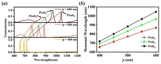To investigate the effect of the periodicity, the transmission spectra of the proposed structure for various periods are calculated in Figure 5a. It is demonstrated that the peak positions are redshifted with an increase of the period p. This is because the resonant modes show the second-order Bloch-wave nature and the resonant wavelength can be estimate as [19,26]. With increasing the period p, the resonant wavelength becomes larger and redshifted. It is proved in Figure 5b that the resonant wavelengths of the peaks are linear with the period and the low-order of the resonant mode moves more quickly than the high-order does from the analysis of slope. Meanwhile, the widths of the peaks are broadened and the interval between the peaks is larger compared to the small period. This is because it is noted that, for a large period (), the transmittance of is reduced sharply, and the Peak2 is becoming wider and deforms, and even disappears if we further increasing the period. This is because Peak2 is near the cut-off frequency and would disappear above the cut-off [19], thus we need to redesign the dimensions of structure for a large period.