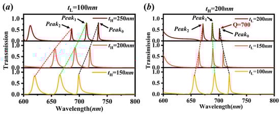 Similarly, with increasing the LID thickness , the real Neff decreases for the TM0 and Peak0 modes, but increases for the TM2 and Peak2 modes and varies little for TM1 and Peak1 modes [19]. Therefore, we can see from Figure 6b that the Peak2 has an obvious red shift, Peak1 only redshifts slightly while Peak0 has a blue shift with increasing the LID thickness . This would make the peaks seem to be concentrated at one point, thus the interval between the peaks is reducing. The peaks’ widths are also reducing effectively, for , of Figure 6b, the width of Peak0 is down to ~1 nm (), however, the transmittance is descending obviously. Therefore, by modulating the thicknesses of the HID and LID, the Q factor can be improved further at the cost of transmittance.