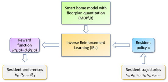 In the case of an MDP\R problem, one RL challenge is to find an optimal policy when the rewards are unknown. This is where inverse reinforcement learning plays an important role, because IRL extracts a reward function given the observations of an agent executing actions [50]. Often, IRL learns a reward function from observing an agent perform a plan. If the agent is an expert in the problem domain, this process allows IRL to learn the reward that is consistent with the expert’s reward function. RL can learn a policy consistent with the reward, thus allowing the agent to imitate the expert’s strategy. In this way, an automated agent can imitate the strategy of the expert. For our proposed work, we consider learning a reward function of a smart home resident. The goal is not to optimize the performance of actions within a smart home by imitating an expert, but to model and analyze the reward function that drives behavior [51] for a particular smart home resident.