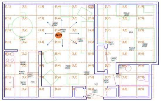 To model a smart home resident’s decision-making process, we defined an MDP\R with a finite set of states and a finite set of actions. For this problem, each state s ∈ S is a spatio-temporal region, specified by a geographical cell location and a time slot. Similarly, action a ∈ A is one of nine possible choices. These consist of staying in the same cell or navigating from the current cell to one of the eight adjacent cells. Reward R is represented by the inner product of a feature vector ϕ and the preference/weight vector θ. Figure 3 shows an example of a smart home decision space within the MDP\R. Here, the space is the residence floor plan, represented as a grid containing axis-aligned cells (indicated by dashed lines in the figure). Each cell, labeled with its corresponding row and column number, represents a single state in the MDP. The resident’s navigation choices, or possible actions, are depicted for one cell with blue arrows in the figure.
