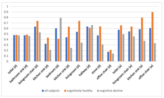 We can make several observations based on the ANOVA results summarized in Table 6. First, the overall differences between individuals are greater (the p values are smaller) for the cognitively healthy participants than for those with cognitive decline. Second, the differences between individuals experiencing cognitive decline are comparable to over-time differences for individuals within this diagnosis category. Since most of these participants transitioned to greater cognitive impairment over time, this result is not surprising. Third, the between-person differences for cognitively healthy participants are greater than the within-person, over-time differences. Specifically, we can see that this group differs significantly (p < 0.05) in terms of time spent in the living room, as well as the kitchen sink and the office chair. These differences may reflect lifestyle differences, balancing time spent cooking, working, and relaxing. For the participants experiencing cognitive decline, the greatest difference occurs in time spent at the toilet, which exhibits a statistically significant difference.