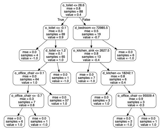 One of the learned decision trees (based on non-normalized values) used to predict whether a smart home resident is cognitively healthy (value = 1.0) or is experiencing cognitive decline (value = −1.0).