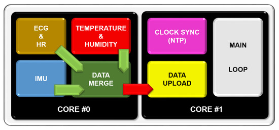 As the ESP32 micro-controller provides two cores, accessible through a FreeRTOS [13] implementation, data acquisition has been split up into different tasks and assigned to one of the cores. As can be seen in Figure 5, core #0 contains four tasks in total assigned to different sensors: temperature and humidity (determined by the sensor choice described in the next chapter), IMU (Inertial Measurement Unit), ECG (Electrocardiogram) and HR (Heart Rate). The fourth task receives data from the other three and packs them properly before uploading. This data transfer is carried out by means of the message queues available in FreeRTOS.
