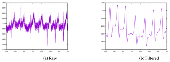 It should be noted that all the sensors can be replaced if more accuracy is needed, but data obtained as a result of the tests was good enough to fulfil expectations. On that thought it is important to note the fact that the AD8232, as opposed to other ICs available on the market, does not provide the HR value directly. It outputs an analogue signal that represents the ECG of the patient’s heart along with a huge amount of noise (Figure 8a), therefore some processing is needed to get a clearer representation. For this prototype a simplification of the Pan–Tompkins algorithm was used [17]. First, a Butterworth filter was used, allowing the signal to look closer to a real ECG (Figure 8b). From this filtered signal, a simple threshold is applied to isolate the R peaks and convert it into a binary stream. Those peaks will be then represented by 1s, thus simplifying the process of measuring the elapsed time between two successive R waves.