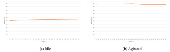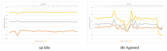 As was previously mentioned, the agitation state involves a number of sudden and violent movements that are precisely captured by an accelerometer. A graphical representation of the data obtained from the IMU for an idle and an agitated patient can be seen in Figure 9a,b, respectively. From those signal representations it seems obvious to establish that the information provided by the accelerometer will be vital to detect changes in a patient’s status, especially when combined with the other measured magnitudes. It is also relevant the huge variations observed in perspiration, as shown in Figure 10.
