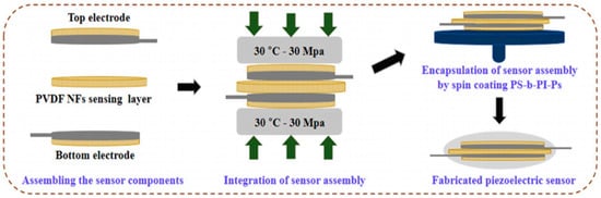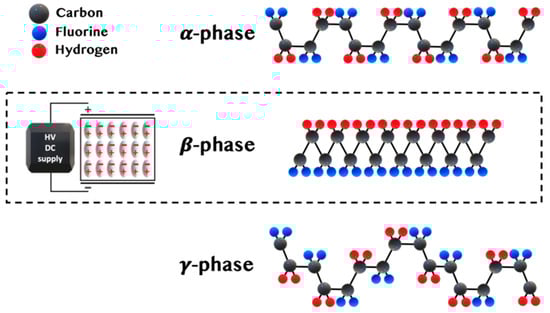 Although β-phase PVDF is very attractive for reasonable electrical output generation, the orientation of monomers is costly and requires either mechanical stretching or high voltage application (Figure 1). Such an operation is called ‘polarization’. The high electric field rotates molecular dipoles in the same direction []. The poling process’s difficulty is that the electric field can only be applied along the surface of the material. As a result, this creates potentially different stress and strain generation [].