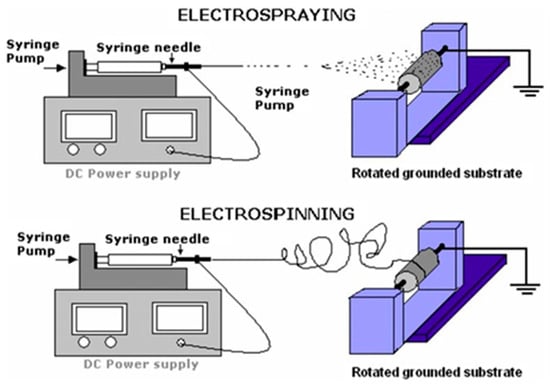 Figure 3. Electrospinning/electrospraying setup. Reprinted with permission from []. - (2)