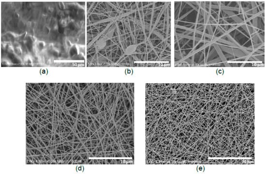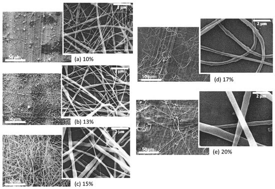 Variation of electrospun membrane morphology with polymer concentration. Original magnification: 500× (left) and 10 k× (right). Voltage: 5 kV; flow rate: 0.3 mL/h; distance: 10 cm; DMF/acetone = 8/2. (a) 10%, (b) 13%, (c) 15%, (d) 17%, (e) 20% Reprinted with permission from [].