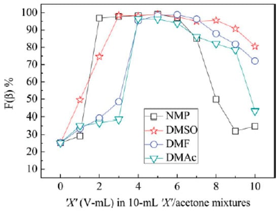 Calculated fractions of β-phase of the above electrospun membranes as a function of mixed solvents with the different “X”/acetone volume ratios for the corresponding 16 wt.% PVDF solutions. The “X” stands for the fraction of one of the four solvents. Reprinted with permission from [].